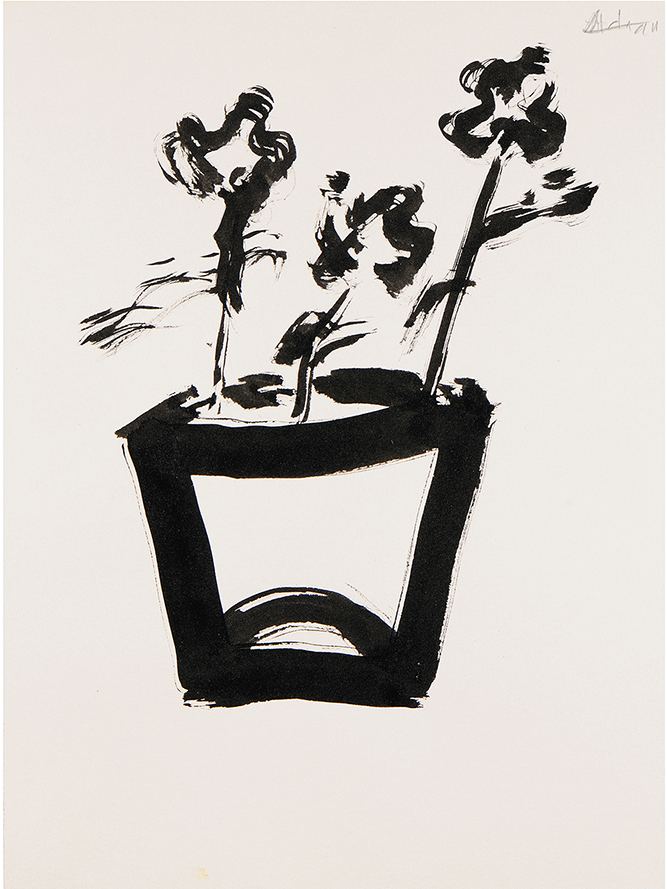 Fr. Les peintures de la série Découverte de l’immédiat d’Etel ADNAN, réalisées à l’automne 2021, sont comme des fenêtres ouvertes sur ce monde que l’écrivaine-artiste a aimé et évoqué, tant par sa plume qu’avec ses pinceaux. Natures mortes, arbres et montagnes sont dessinés d’un seul trait à l’huile noire et baignent dans la lumière éclatante de la toile blanche.