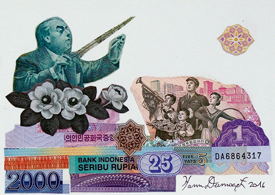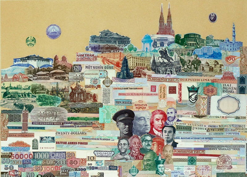 Yann Dumoget has for many years collected banknotes from all over the world. The inevitable destiny of these notes, over a long period of time, is to lose their financial value as they are replaced by new series of notes. All that remains of these small, engraved masterpieces printed on precious paper are their colours and their motifs. By cutting out, assembling and then gluing his pieces onto sheets of cardboard, Dumoget creates new landscapes; he outlines cities, brings together colours from all around the world and revisits history in the light of humanity, both destroying and enhancing money, the object of all covetousness.