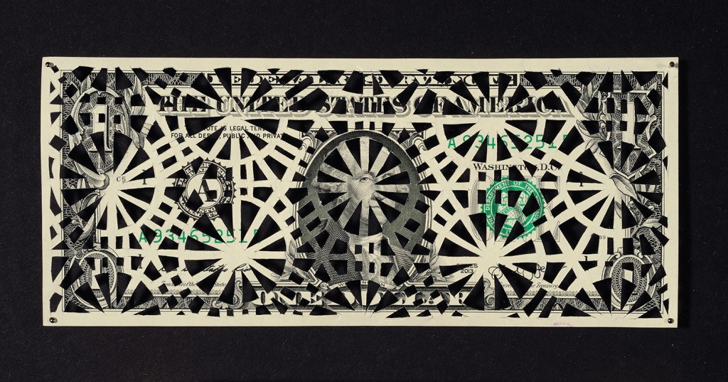 Samuel Coisne draws and cuts out, with elaborate, refined and precise dexterity, minute geometric and vegetal forms in the banknotes. Playing with the fragility of the note, he pins it to a cardboard background and transforms this power icon into a rectangle (or circle) of lacework, enhancing the shadows and the light. Humour and cynicism are never far away: each work, of an initial value of 1$, could fetch, if sold, several hundred dollars.