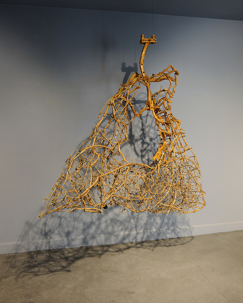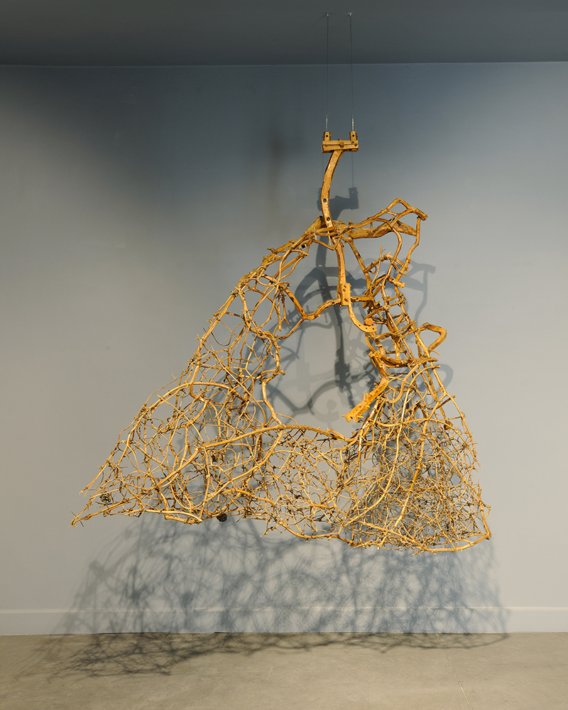 At the beginning, it was a line created by nature, like a tree branch. Over time, however, while confronting the still new aesthetic contexts of spaces assigned for my projects (I call them “existing energy”) and striving to make my artistic vision (“introduced energy”) harmonize with a particular space, I have started to use other materials to define lines. For every particular project, I would purposefully select structural materials for their properties and aesthetic values. While not in a starring role, they are nevertheless important for the aesthetic expression and impact of my spatial compositions.