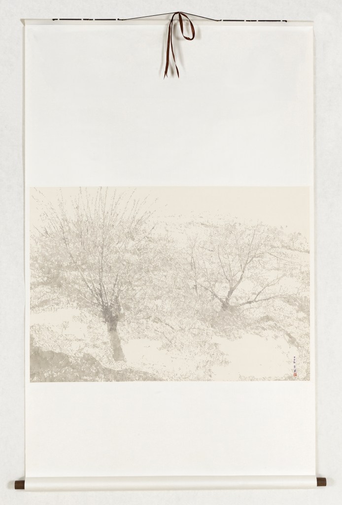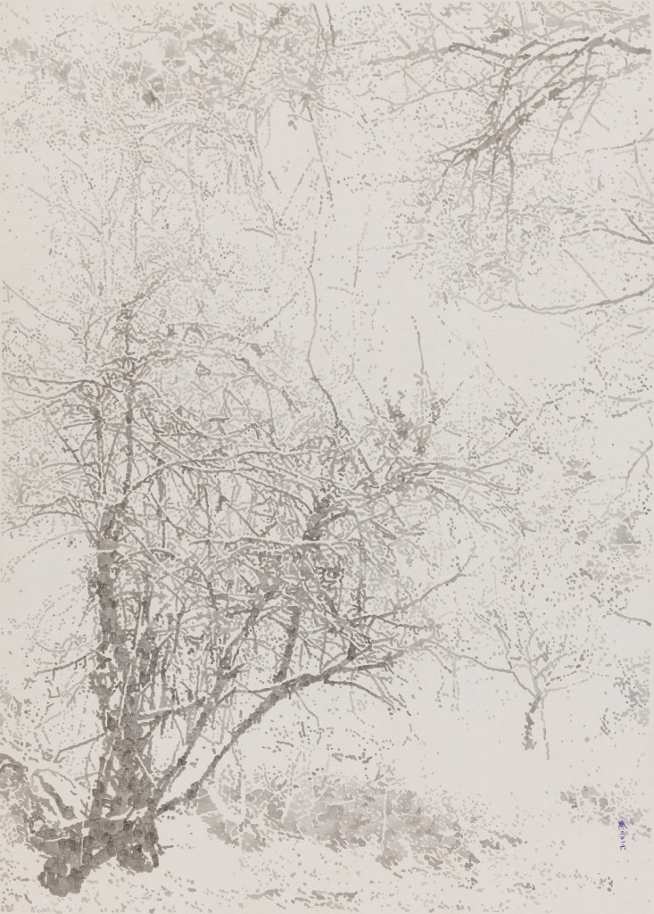 Fr. Chez Li WEI, la brume enveloppe les branches dénudées des arbres. A l’écoute de la neige, série de paysages peints à l’encre noire diluée sur de la soie blanche, par petits points et traits discontinus déclinés en une infinie gamme de gris, explore le silence du paysage ou la splendide radiance de la lumière hivernale.