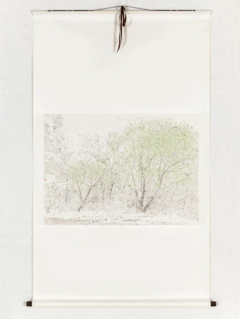 Eng. In Li WEI’s works, mist envelops the trees’ naked branches. Listening to the Snow, a series of landscapes painted with black ink applied onto white silk as small dots and dashed lines that dilute into an endless range of grey tones, explores the silence of a landscape or the splendid radiance of winter light.
