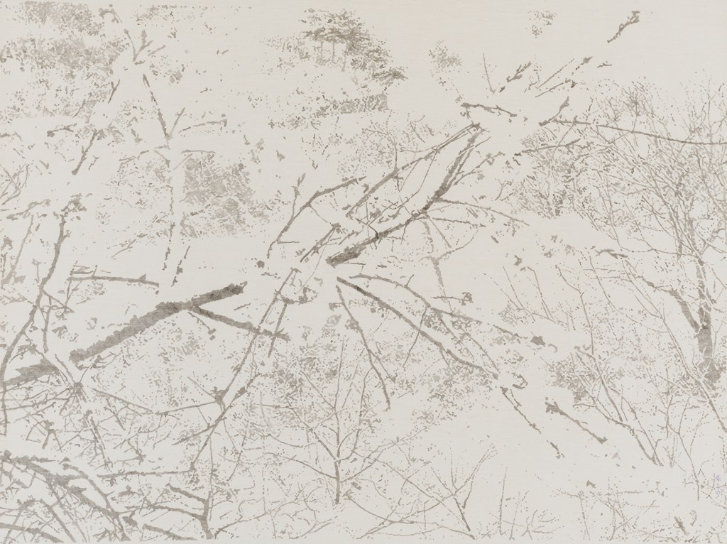 In Li WEI’s works, mist envelops the trees’ naked branches. Listening to the Snow, a series of landscapes painted with black ink applied onto white silk as small dots and dashed lines that dilute into an endless range of grey tones, explores the silence of a landscape or the splendid radiance of winter light.