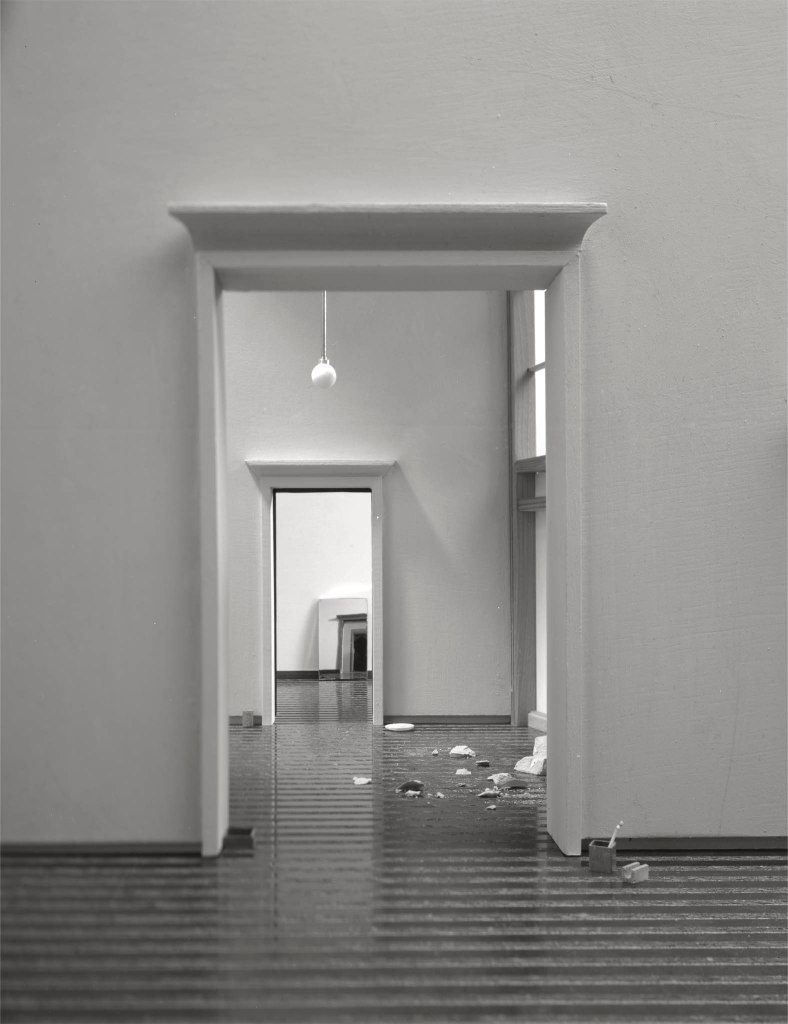 The model is then placed on a plinth in the studio to be lit in the same way as one would illuminate a cinema set. Following the rules of architecture photography, he produces an image which is then printed in large format, in black and white.