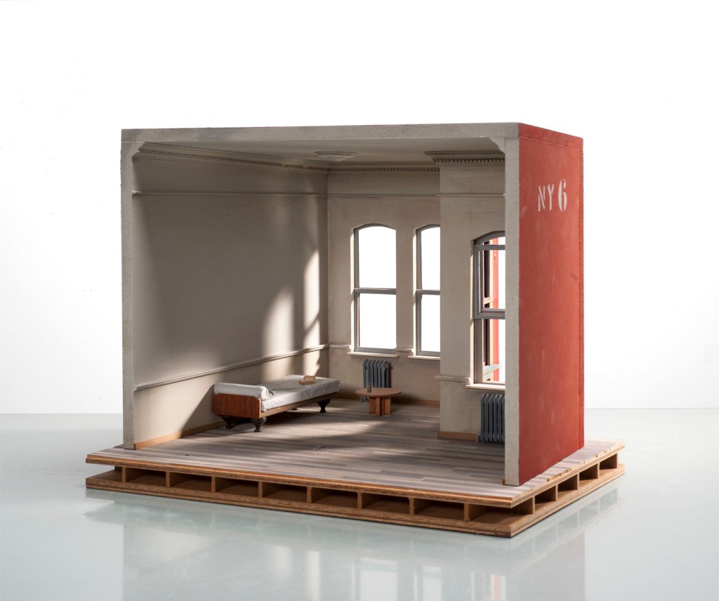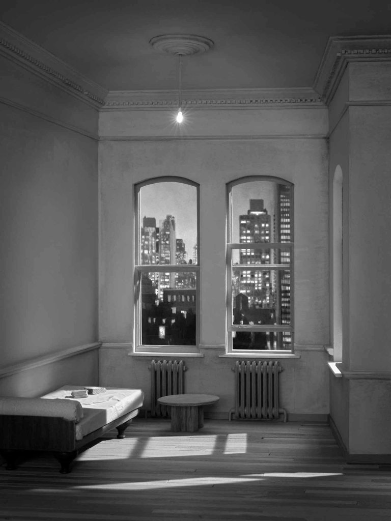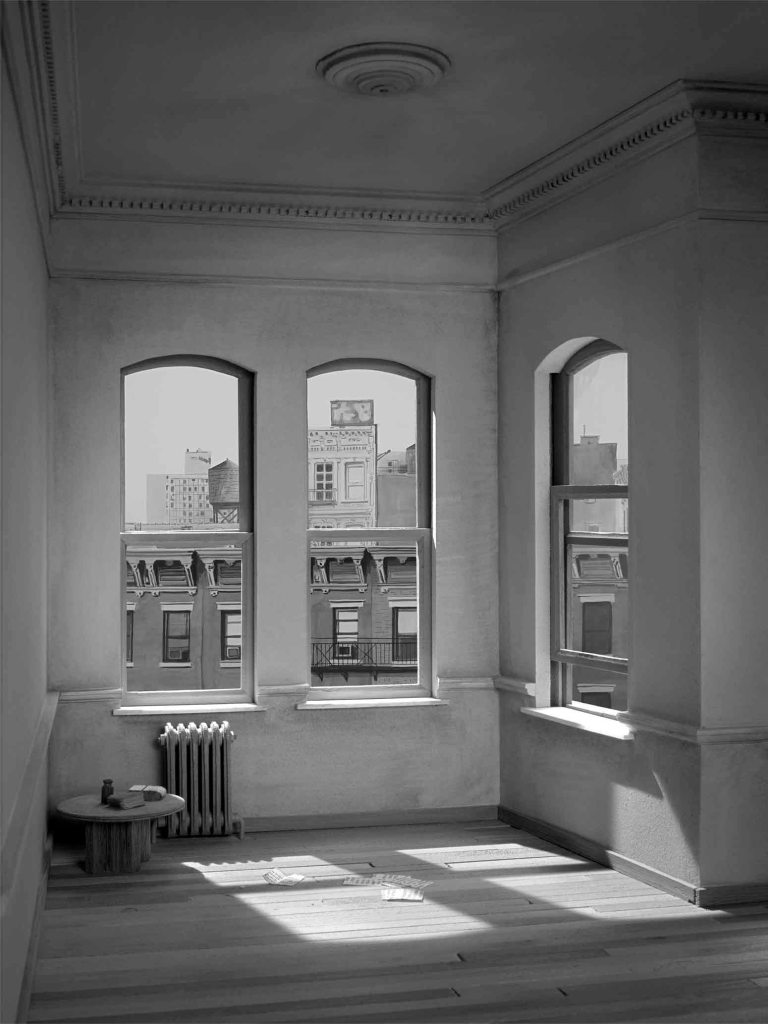 Philippe De Gobert: studio journeys is the artist’s first solo exhibition with Galerie Alice Mogabgab. The exhibition is curated by Michel Baudson and presents two sets of photographs; the first from 2010, inspired by a painting of a Dutch interior from the 17th century, shows a series of doors and almost empty rooms, in which the light magnifies the infinite space; the theme of the second set is New York studios, freely inspired by, for example, Donald Judd’s loft or an Edward Hopper painting, so as to accentuate the strange atmosphere or the light of a sunny morning, with the view over the city’s rooftops. A model of each space/subject is also presented, to remind us of the scale of the original.