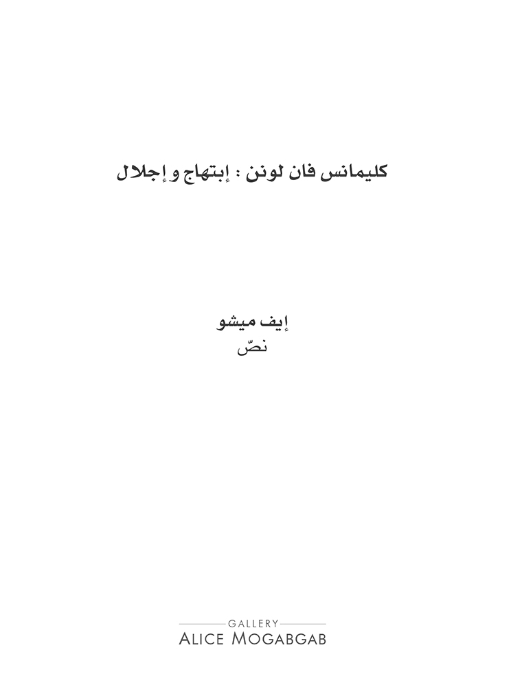 Jubilation is a booklet in French, Dutch, English and Arabic accompanying the exhibition. It contains an essay by Yves Michaud, and is designed and printed in Beirut by the Editions de la Galerie.